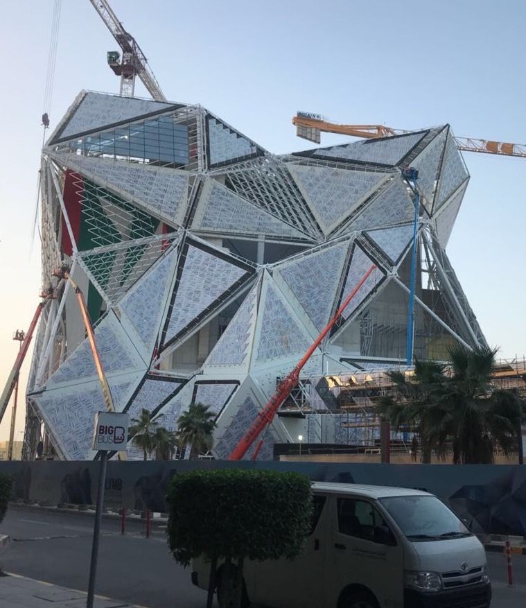 – 800 Tons of custom designed steel structure composed of 68 Triangular shape mega size panels connected with articulated Nods.