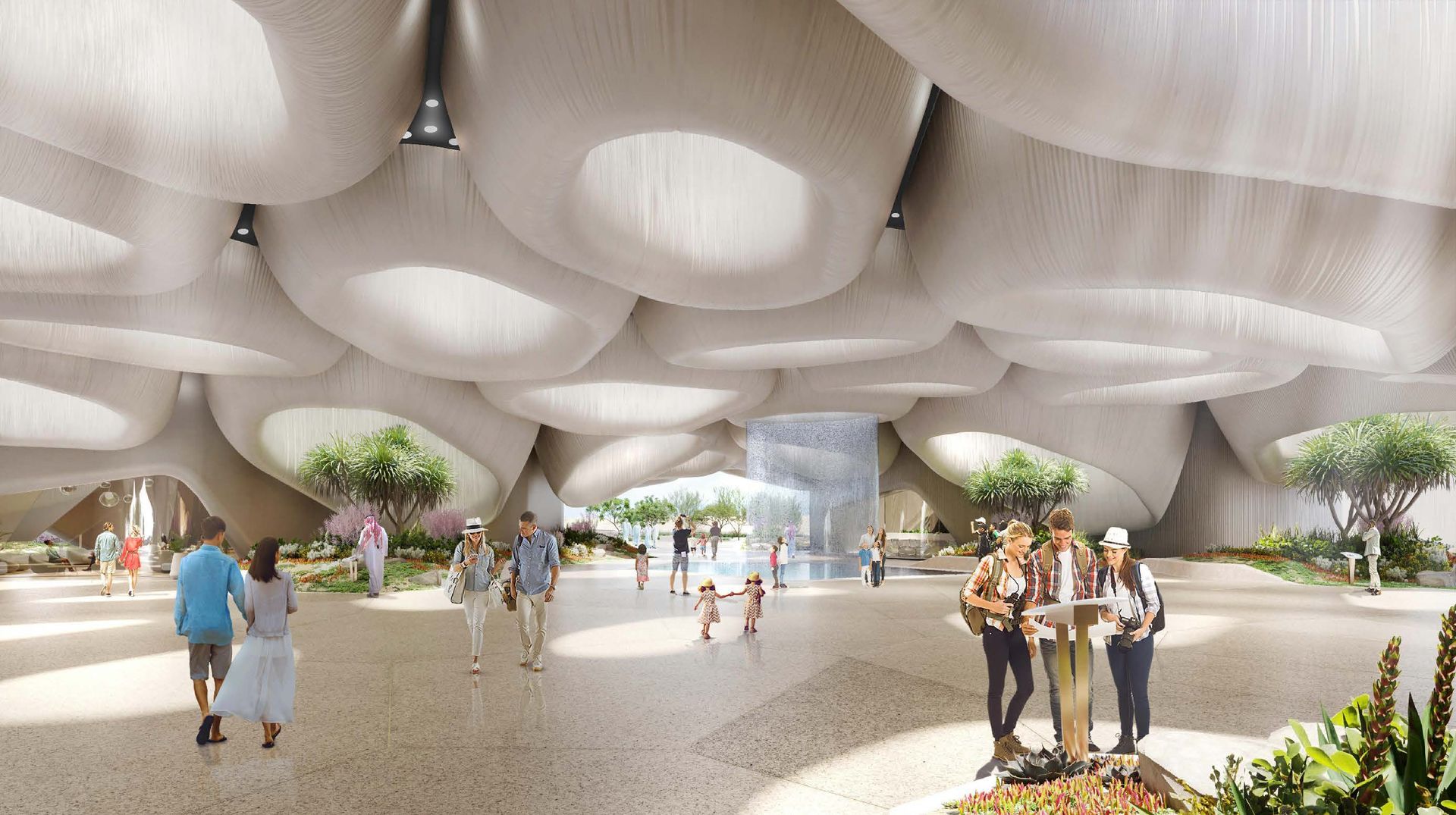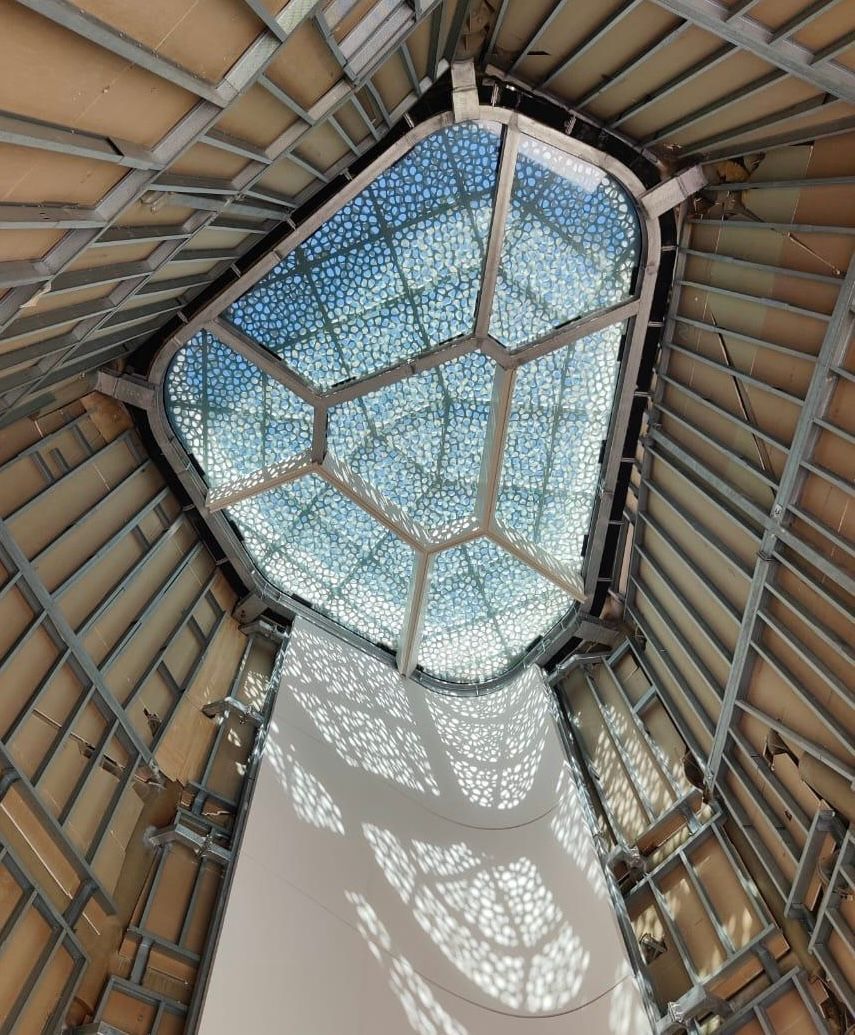 Design, supply, and installation of glazed facades, as well as single and double skin skylights. The incorporation of perforated metal sheets inspired by the pattern of corals creates Voronoi shadow effects below these structures.